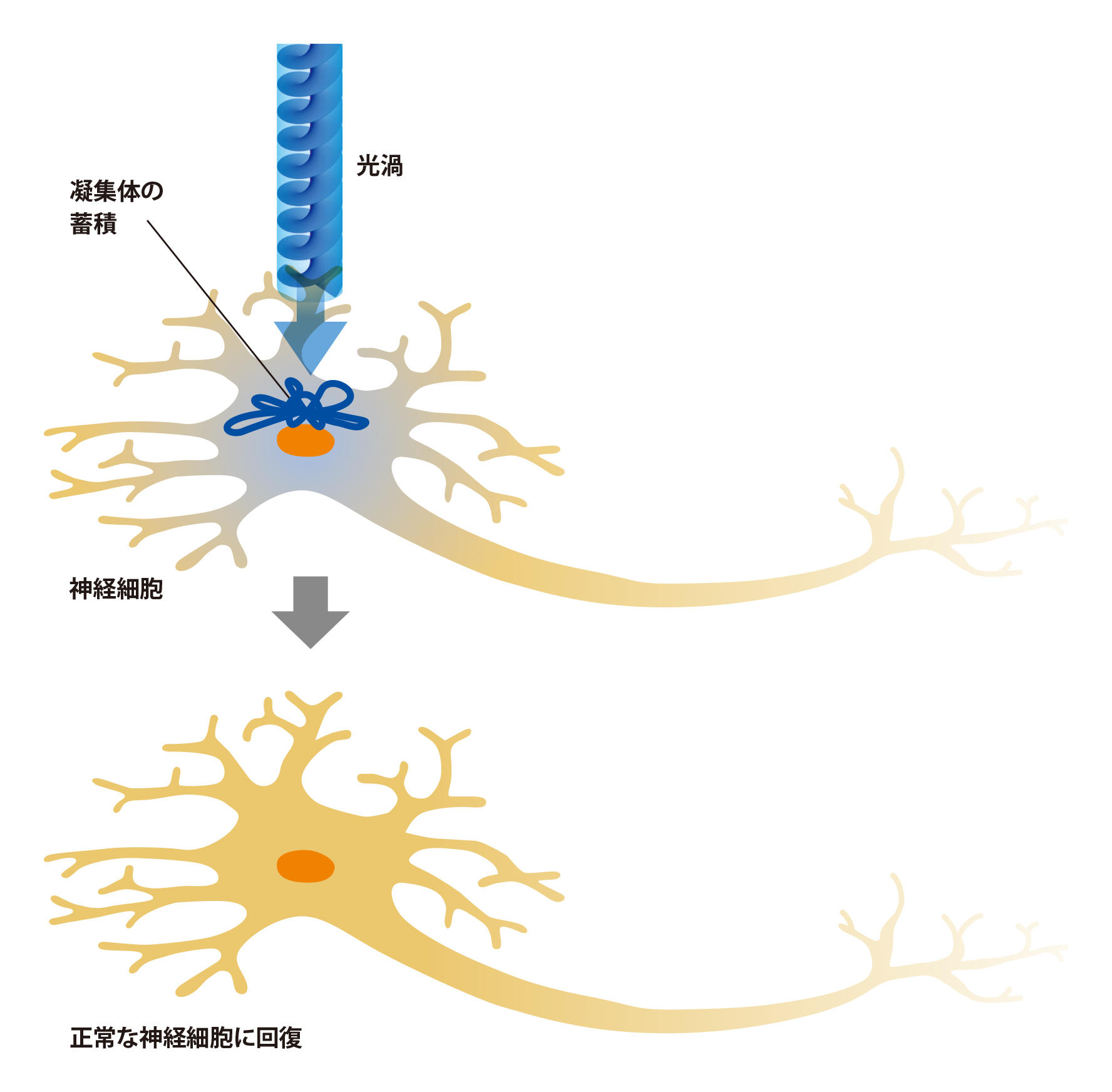 小川さんは、「光渦(ひかりうず)」と呼ばれる特殊な光をパーキンソン病の治療に応用できないかと考えた。光渦はらせん状の波面をもつ光で、照射した物体に回転する力を与える性質がある。この力によって原因となる凝集体をほぐし、さらに光の刺激で細胞を活性化させれば、ドパミンを再び産生できる状態に戻せるのではないかと思いついた(図1)。