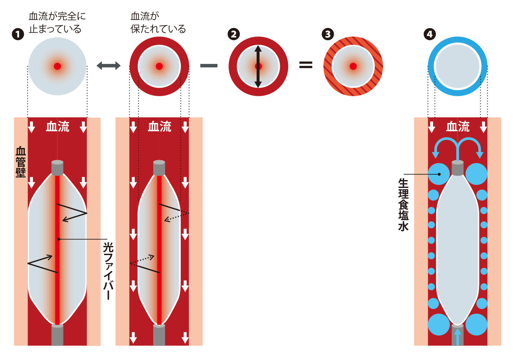 ❹ 生理食塩水を注入し光強度の時間変化から血流速度(m/秒)を計測する。❸×❹=血流量(m3/秒)