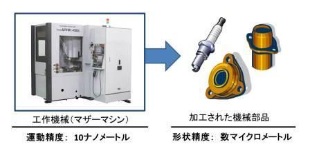 ここで、マザーマシン自身とマザーマシンから作り出された機械部品の精度について考えてみましょう。人間であれば、生まれた子供は両親の能力を超えて親よりも立派になることもあるでしょう。しかし、機械はそういきません。マザーマシン以上の精度で加工されることはないわけですから、産み出された機械部品達は決してマザーマシンの精度以上にはならないのです。これを「母性原理(Coping principle)」と呼びます(図1)。つまり、優れたマザーマシンがなければ、優れたモノが産まれないわけです。