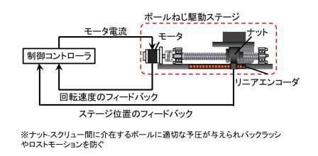 工作機械はものづくりをするロボットとして捉えることもできますが、その性能を産業用ロボットと比較してみましょう。産業用ロボットの位置決め精度はその構造から十マイクロメートルオーダが限界であるのに対して、工作機械はサブマイクロオーダで位置決めができます。工作機械の駆動部に用いるボールねじにはロストモーション(動作が反転するときに瞬間的に動きがとまること、運動精度に関わる問題の一つ)を防ぐ工夫がなされており、駆動ステージの位置とモータの回転を両方計測してフィードバック制御(フルクローズド制御)を行っているためです(図2)。また、金属を能率よく削ったり、磨いたりする時には非常に大きな力が工作機械にかかるため、機械に変形が生じます。これを最小限に抑えるため、リブなどの機械構造の最適設計や減衰の高い鋳鉄をフレーム(※実際はコラムやベッドと呼びます)に用いて高い剛性や減衰性を与えています。これに加えて熱設計や振動設計により、初めて機械部品を数マイクロメートルの精度で加工できるようになるわけです。最先端の工作機械はまさに加工学、機械工学、制御工学を結集した技術の結晶なのです。システムデザイン工学科で育った私としては、最高に魅力的な研究分野です。