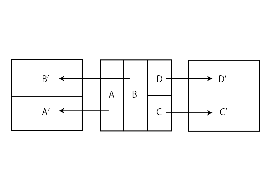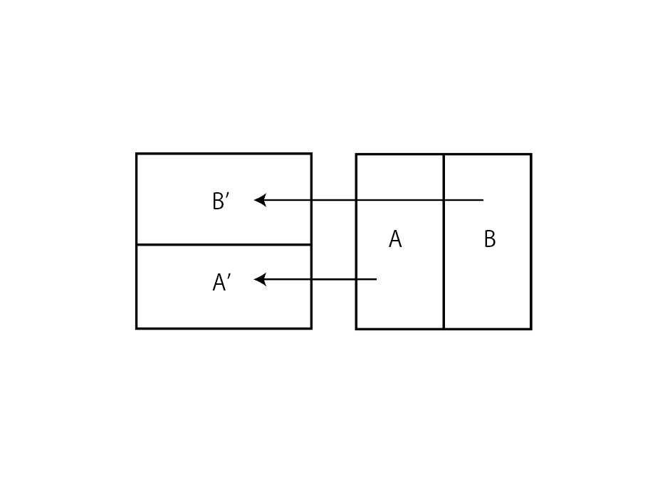 カオスの本質の一部を捉えているモデルを紹介します。以下の図1のように、正方形を2つの部分に分解し、A、Bと名前をつけます。Aを横方向に2倍、縦方向に1/2倍してA’に写し、Bを横方向に2倍、縦方向に1/2倍してB’に写す変換を考えます。小麦粉の生地をこねてパンを作ったことはあるでしょうか?薄く引き延ばして、折り曲げ、また薄く引き伸ばして、折り曲げ、というプロセスを繰り返したことと思います。上の変換は、パン作りにおける小麦粉の生地の変化を数学的に表現しており、ベーカー変換(パイこね変換)と呼ばれます。正方形上の非常に近接したどんな二つの点も、変換を繰り返すことでやがて離れていきます。つまり、初期値の小さな誤差が次第に増幅され、後に大きな変化をもたらすのです。カオスの本質の一部は図形の「引き伸ばし」と「折り曲げ」という幾何学的性質にあり、パイ生地がよく混ざる理由は、「ベーカー変換がカオス的だから」なのです。