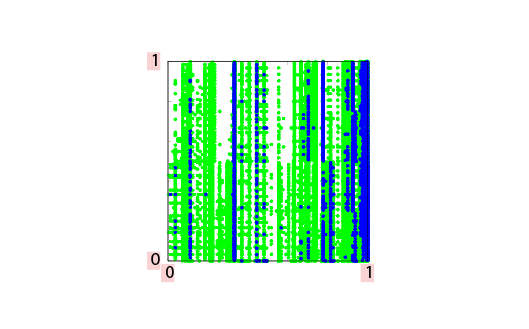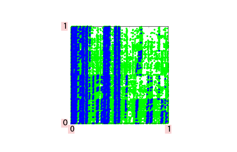 カオスの数学的研究が進むにつれて、ベーカー変換ではモデル化できないようなカオスが存在することもわかってきました。このようなカオスを研究するための新しいモデルを紹介します。以下の図2のように、正方形を4つの部分に分解し、A、B、C、Dと名前をつけます。Aを横方向に3倍、縦方向に1/2倍してA’に写し、Bを横方向に3倍、縦方向に1/2倍してB’に写し、Cを横方向に3倍、縦方向に2倍してC’に写し、Dを横方向に3倍、縦方向に2倍してD’に写す変換を考えます。C’とD’は正方形全体です。この変換では、領域A、Bから受ける影響とC、Dから受ける影響のバランスが鍵となります。図3はA、Bから受ける影響の方が大きい周期点をプロットしたものです。図4は、C、Dから受ける影響の方が大きい周期点をプロットしたものです。色の違いは周期の違いを表しています。周期を大きくしていくと、どちらのタイプの周期点も正方形を埋め尽くしますが、分布の仕方は異なっています。これらのことは最近、数学的に厳密に証明されました。二つの異なるタイプのカオスが切り分けられない形で共存しているため、この変換はヘテロカオス・ベーカー変換と呼ばれます。きわめて単純に見えるモデルですが、まだわかっていないことが多くあり、多くの研究者の興味を引きつけています。